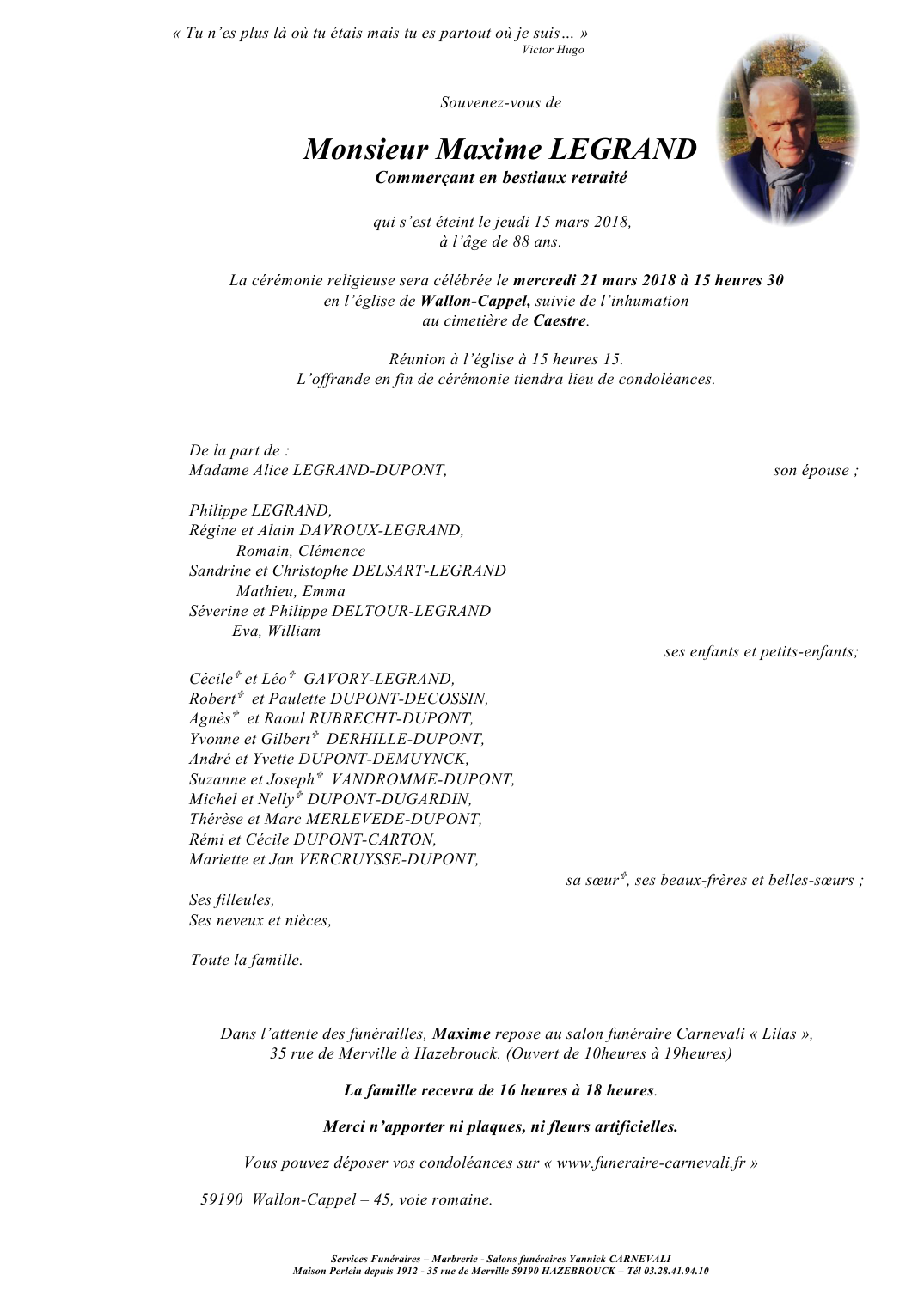 Décédé à Hazebrouck (59190, France) le jeudi 15 mars 2018 à l'âge de 88 ans